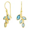 blad mørkeblå krystall øredobber i forgylt sølv med blank overflate og glatt lyseblå krystall.