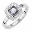 firkantet lilla zirkon ring i sølv med blank overflate og 1 fasettslipte lilla zirkoner og fasettslipt hvit zirkon.