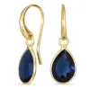 dråpe syntetisk blå safir øredobber i forgylt messing med blank overflate og 2 fasettslipte blå syntetiske safirer.