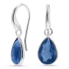 dråpe blå mørkeblå krystall øredobber i forsølvet messing med blank overflate og 2 fasettslipte blå iolitter.