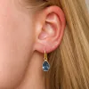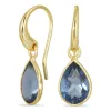 dråpe blå mørkeblå krystall øredobber i forgylt messing med blank overflate og 2 fasettslipte blå iolitter.
