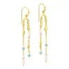 lange kjedeøreringer i forgylt messing med blank overflate og glatt rosa kvarts og glatt blå jadestein.