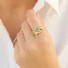 multifarget ring i forgylt messing med blank overflate og 3 fasettslipte lysegrønne krystaller og 3 glatte hvite perler og 3 fasettslipte rosa kvarts.