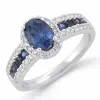 oval blå safir diamantring i 14 karat hvitt gull med blank overflate og 46 briljantslipte diamanter i Wesselton/SI og 9 fasettslipte blå safirer