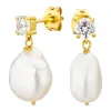 perle øredobber i forgylt messing med matt overflate og 2 fasettslipte hvite zirkoner 2 hvite perler.