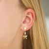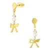 sløyfe øredobber i forgylt messing med blank overflate og glatt hvit klar quartz.