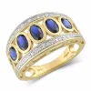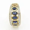 stor abstrakt blå ring i 9 karat gull med blank overflate og 5 fasettslipte mørkeblå syntetiske safirer og 10 fasettslipte hvite zirkoner.