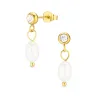 vanntette perle øredobber i forgylt stål med blank overflate og 2 fasettslipte hvite zirkoner 2 hvite syntetiske perler.